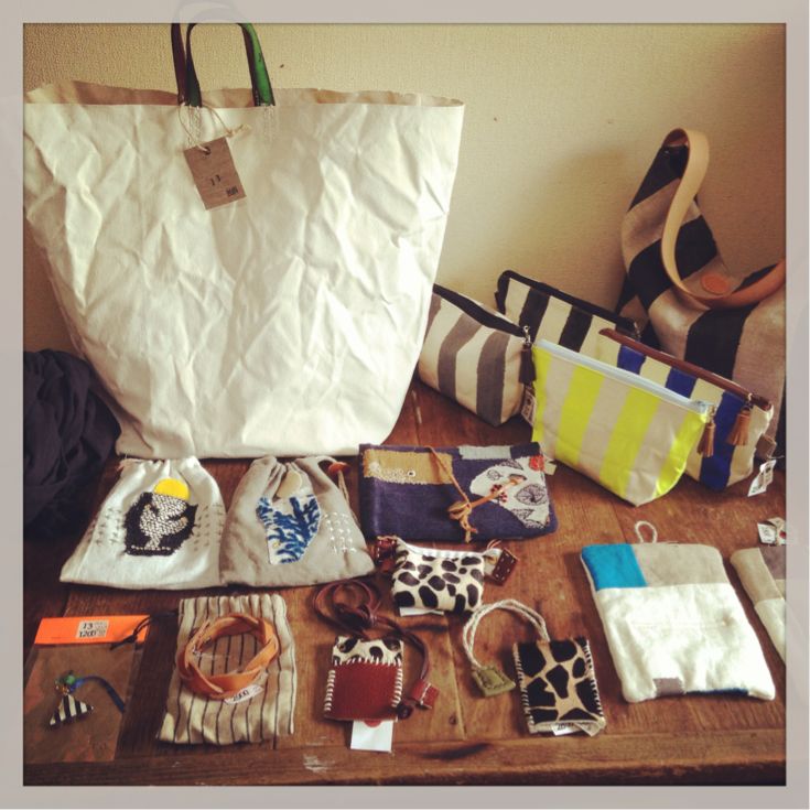 アクリル絵具でペイントしたポーチとバッグ、コラージュ巾着、イヤホンジャック、ハラコの革小物、なべつかみ、ダブルガーゼの大判ストール などなど
