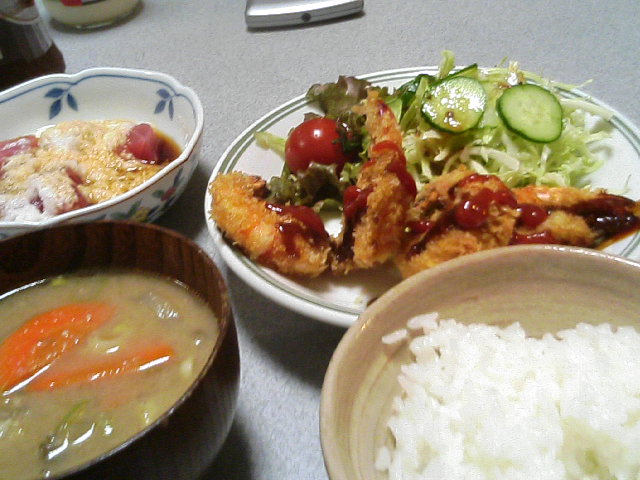 野菜不足を感じて、けんちん汁風のかす汁(どんなんじゃ)エビフライ、サラダ、鮪の山かけ